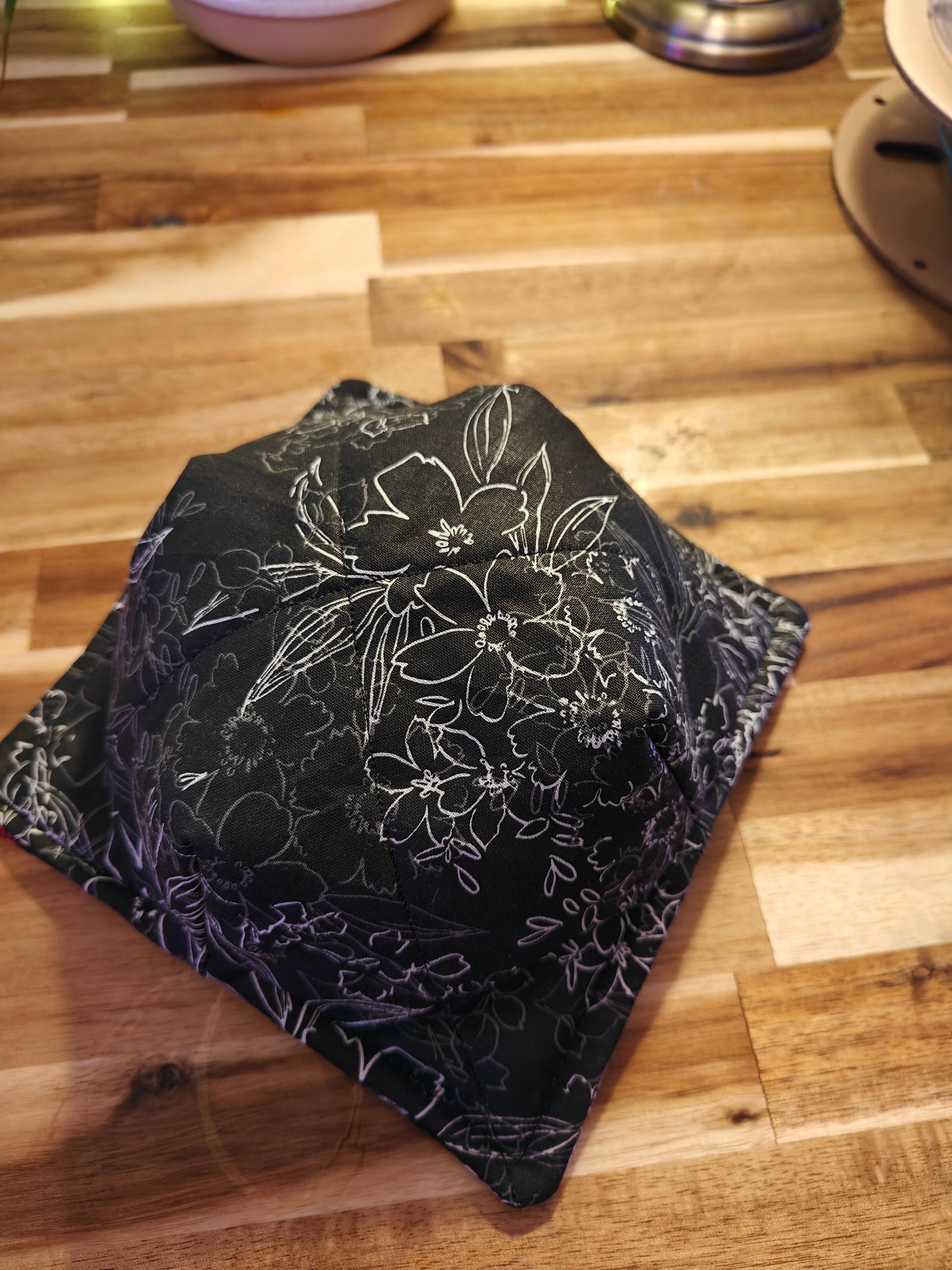 A Bowl Cozy is a triple layered cotton pad that has been shaped perfectly to wrap around a standard bowl size.