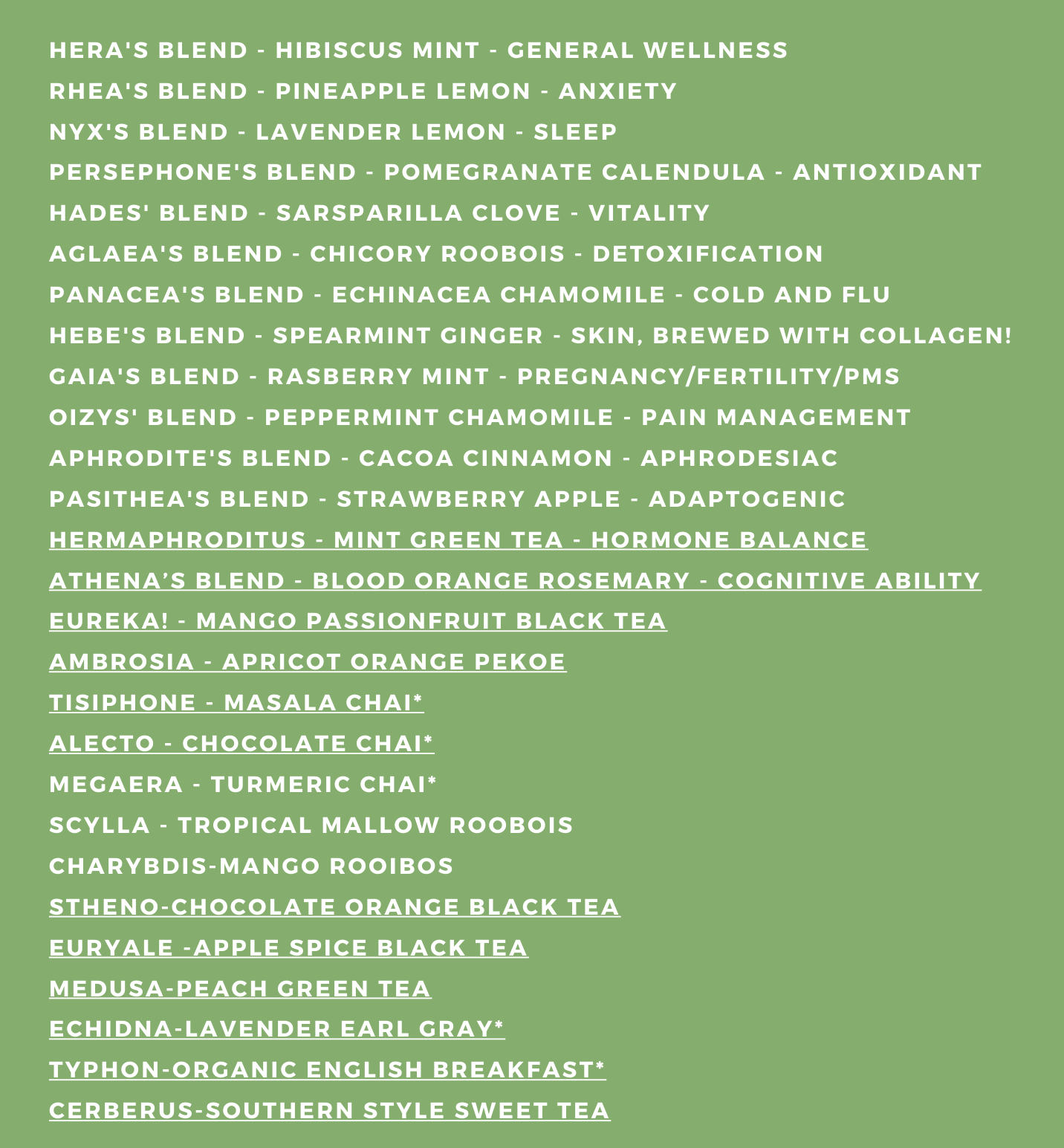 Try up to twelve different blends of our tea! Select 1-12 single servings that will be individually bagged and labeled. The underlined teas are caffeinated, no underline is caffeine free!